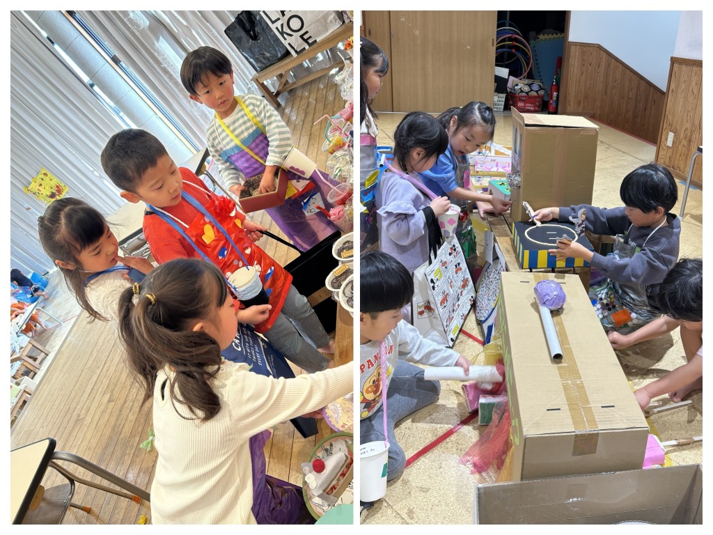 活動の時間や自由遊びの時間を使って食べ物やおもちゃを作って、各売り場でたくさんの品物を売りました。またお風呂屋さんやゲームセンターなどの体験型のお店も開きました!