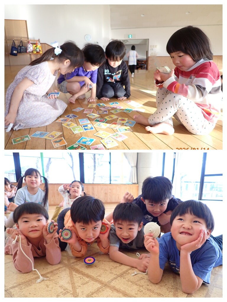 かるたや坊主めくり、コマ、オセロなど自由遊びの時間にしたり、各クラスの活動でもカルタなどしてお正月遊びを楽しんでいる子どもたち。